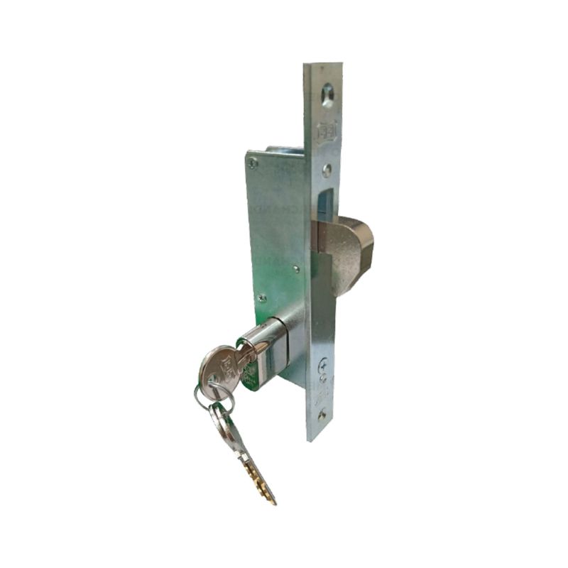 Cerradura para puerta metal con stricke y cilindro ff. Niquel. 53 mm